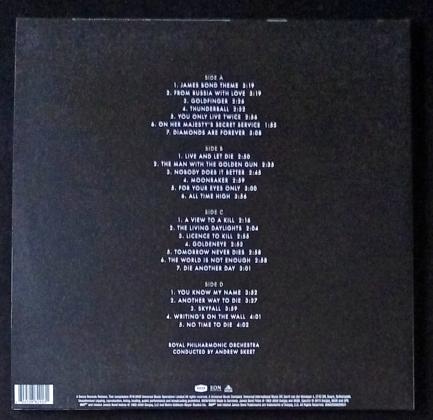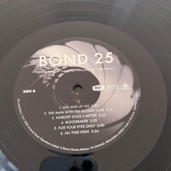 Features: 2×LP double vinyl, new orchestral arrangements of all 25 Bond themes, recorded at Abbey Road Studios, heavyweight pressing, Gatefold sleeve. Issued in a gatefold sleeve with a soft-feel coating. The barrel swirl design at the front features a spot gloss varnish detail. The interior sections of the holding pockets are printed matte black.