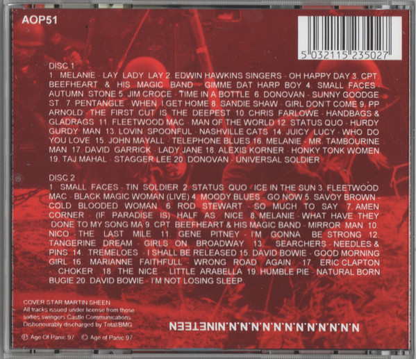 Artists include The Searchers, Donovan, Captain Beefheart, Rod Stewart, Small Faces, Fleetwood Mac, Status Quo, Jimi Hendrix, John Lennon, David Bowie, Pentangle, Nico, Jim Croce, Melanie, and many more, representing the decade's diverse sounds.