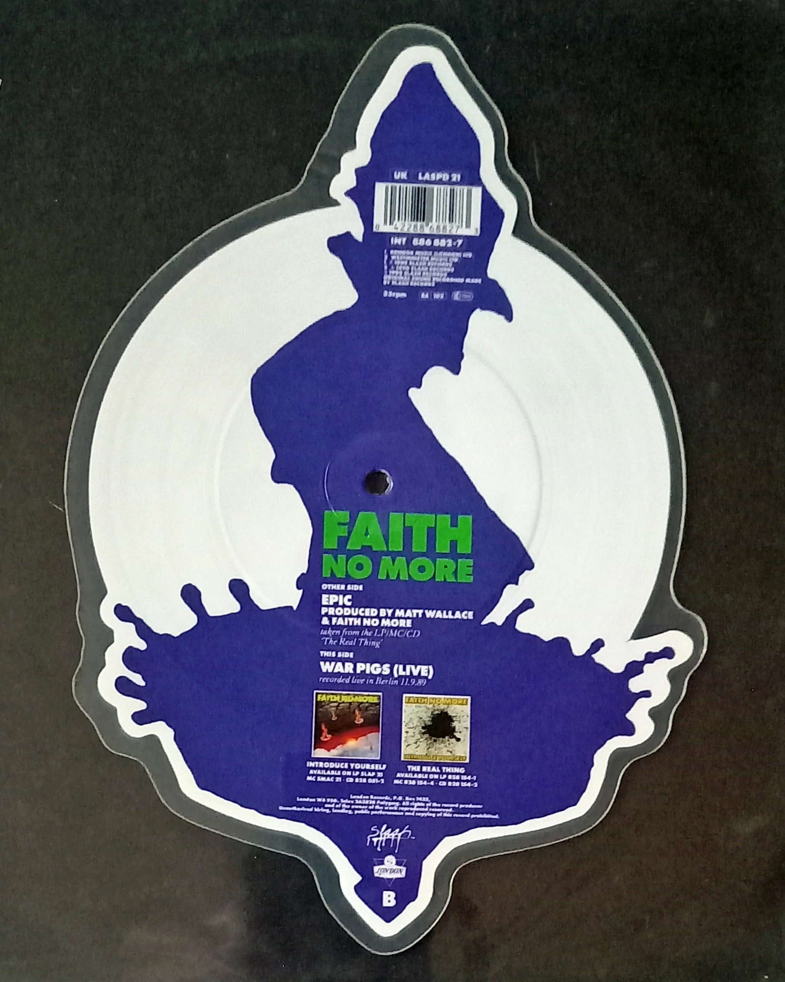 This striking UK picture disc pairs Epic, the genre-defining breakthrough single from Faith No More, with their powerful live cover of Black Sabbath’s War Pigs. Issued as a limited picture disc under catalogue LASPD 21, it’s a highly collectible release from the band’s late-80s rise, combining visual appeal with two iconic performances that helped cement their reputation for crossing metal, funk and alternative rock.