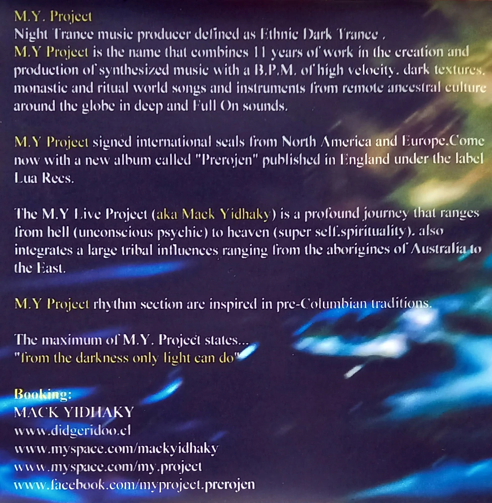 Prerojen by M.Y. Project is a full-length journey through ethnic dark psytrance, combining high velocity rhythms, ritual chants, tribal instrumentation, and deep psychedelic atmospheres. Inspired by ancient cultures, spiritual concepts, and inner exploration, the album moves between intense dancefloor energy and immersive sonic storytelling. A distinctive underground release with strong identity, blending dark trance with global ancestral influences.