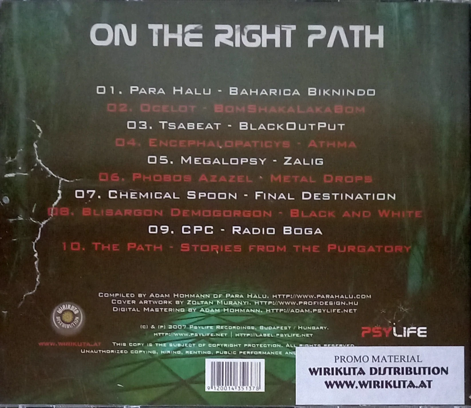 On The Right Path is a psytrance and experimental compilation released on Psylife Music in Hungary in June 2007. This CD features a wide range of artists exploring both melodic and dark forest psytrance, blending hypnotic grooves, textured atmospheres, and innovative sound design. With tracks from Phobos Azazel, Chemical Spoon, Blisargon Demogorgon, and others, the compilation delivers a varied and immersive listening experience, making it a strong addition for DJs and collectors of underground European psytrance.