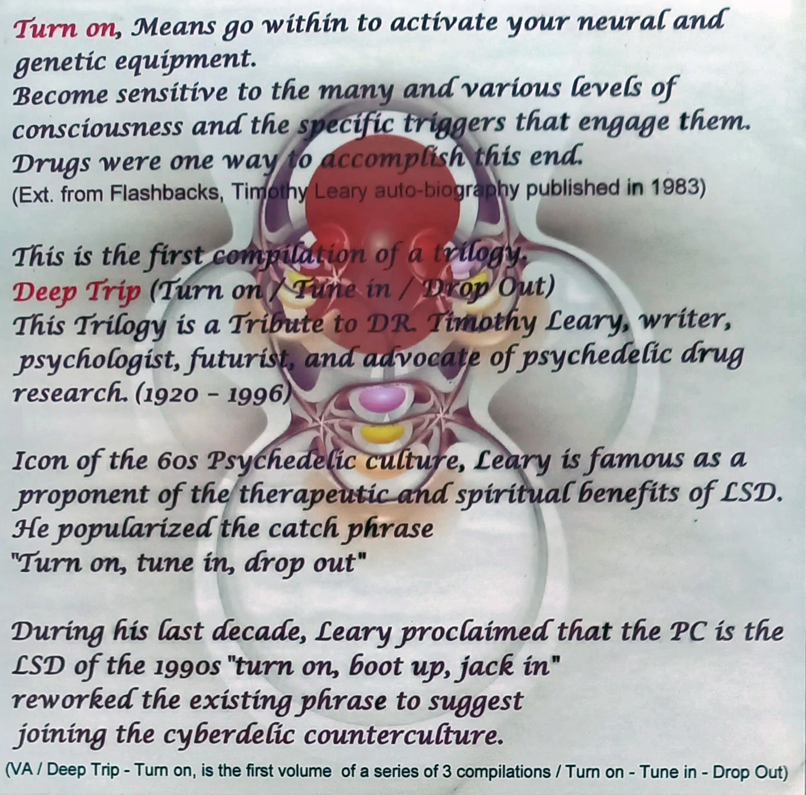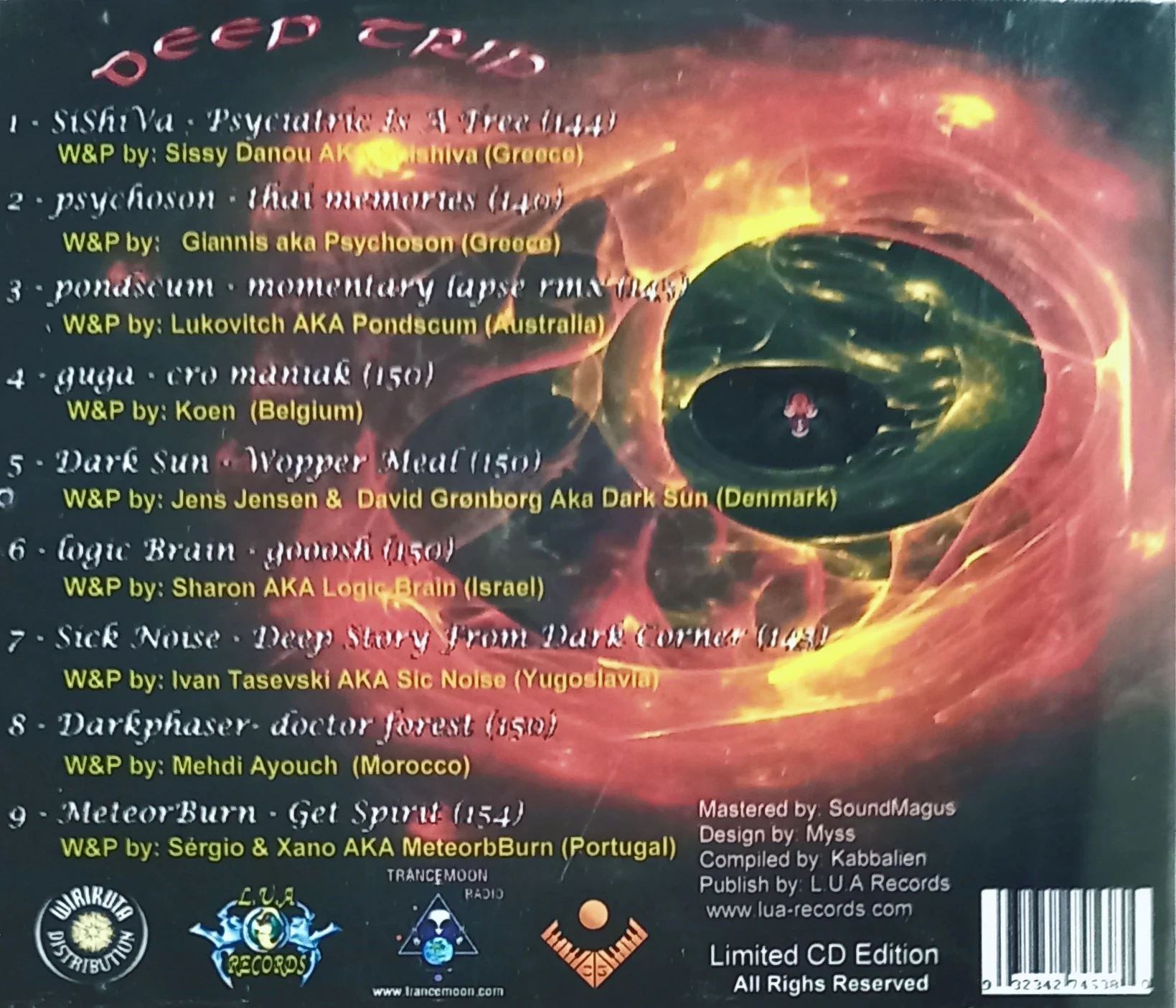 Deep Trip Trilogy - Turn on (Vol 1) is the first chapter in Lua Records’ three-part compilation series inspired by the ideas of Dr Timothy Leary and the wider psychedelic movement. Compiled by Kabbalien, this release gathers emerging and established producers from across the international darkpsy scene, delivering a powerful selection of forest sounds, twisted rhythms, and underground psychedelic energy. A landmark early Lua Records compilation with strong collector value and historic label importance.